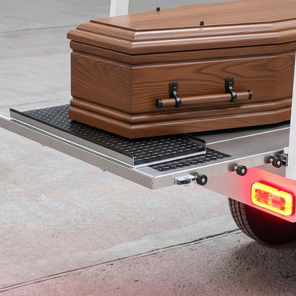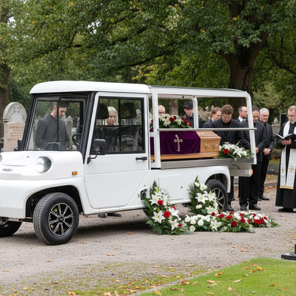 Der N.30 Leichenwagen ist ein modernes, elektrisches Fahrzeug, das speziell für die Bestattungsbranche entwickelt wurde. Er wurde so konstruiert, dass er leise und reibungslos unter allen Bedingungen arbeitet. Er zeichnet sich durch hohe Zuverlässigkeit und niedrige Betriebskosten aus. Die kompakte Bauweise wurde entwickelt, um das einfache Manövrieren durch enge Friedhofswege zu ermöglichen. Besonders hervorzuheben ist die elektrisch ausziehbare Sargplattform, die die Handhabung erheblich erleichtert und die Arbeitsergonomie für Bestattungsunternehmen verbessert. Zusätzlich stehen Kranzhaken und ein praktisches Staufach unter der Plattform zur Verfügung. Die Kabine kann beheizt werden, was den Komfort zu jeder Jahreszeit erhöht. Das moderne Fahrwerk und die Konstruktion verbessern Stabilität und Fahrkomfort, während der Langsam/Schnell-Schalter präzises Manövrieren in engen, eingeschränkten Bereichen ermöglicht. Ein 7-Zoll-Touchscreen erhöht zusätzlich den Bedienkomfort. Das Fahrzeug kann mit Blei-Säure- oder Lithium-Ionen-Batterien ausgestattet werden sowie mit einem eingebauten Ladegerät, das bequemes und schnelles Laden an jeder normalen 230V-Steckdose ermöglicht. Der Innenraum bietet profilierte Sitze mit Kopfstützen, einen USB-Anschluss, Ablagefächer und ein Radio. Die 13-Zoll-Aluminiumfelge unterstreicht den eleganten Charakter des Fahrzeugs.