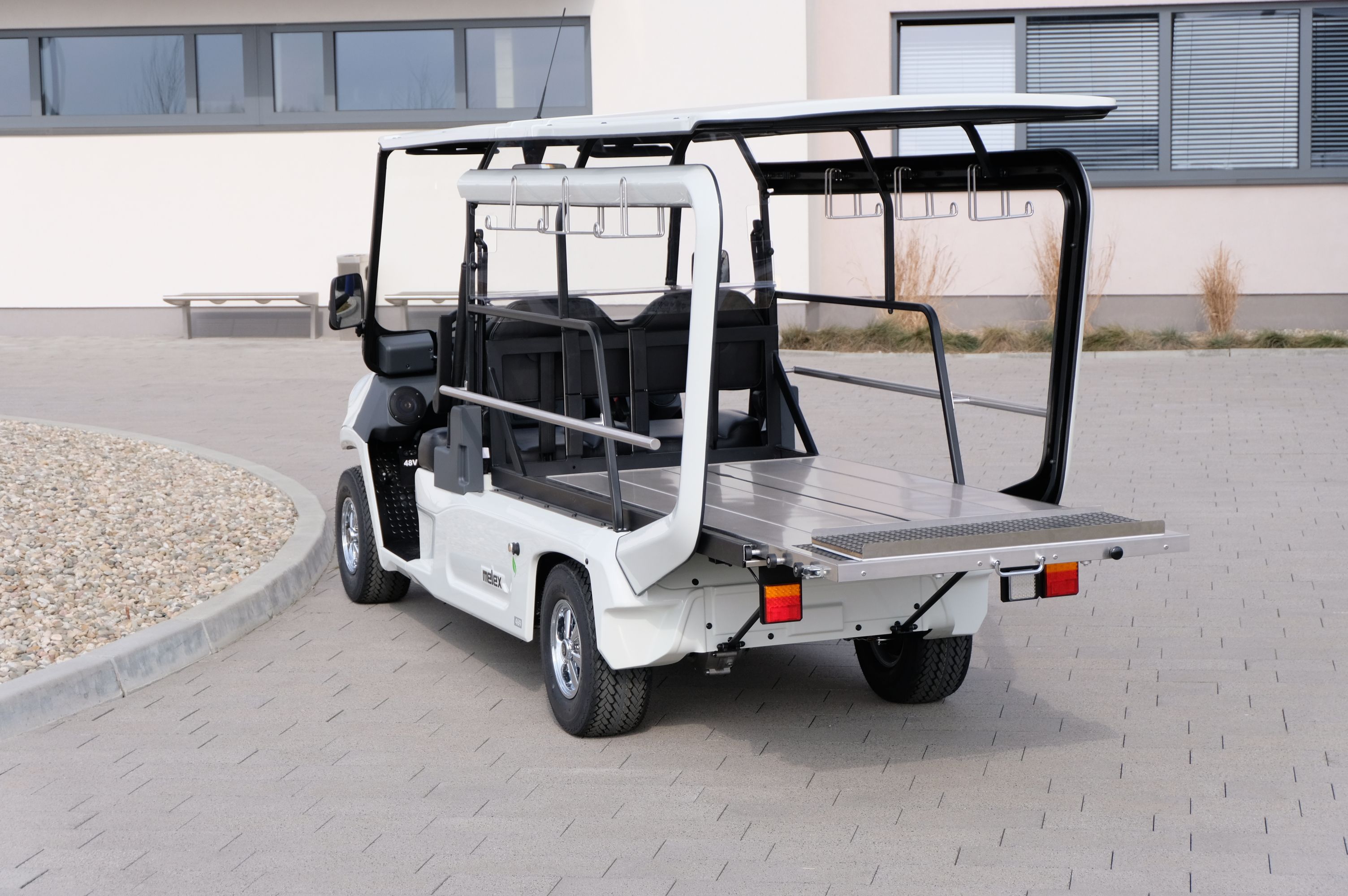 Das neueste Modell des elektrischen Leichenwagens von Melex. Es zeichnet sich durch eine komplett neue Stilistik aus. Einerseits knüpft sie an die ersten Melex-Modelle, andererseits betont die Modernität der eingesetzten Lösungen. Die Mehrlenker-Aufhängung verbessert deutlich den Fahrkomfort und die Wendigkeit des Fahrzeugs. Die vollständig neue Form des hinteren Teils des Fahrzeugs betont die Robustheit der gesamten Konstruktion und verleiht ihr das moderne und originelle Aussehen. Die Mehrlenker-Aufhängung gleicht Unebenheiten aus. Der Schalter zur Geschwindigkeitsbegrenzung erlaubt flüssige Bewegung auch bei sehr kleinem Tempo. Der hochqualitative Aufbau ist standardmäßig mit praktischen Haltern für Kränze ausgestattet.